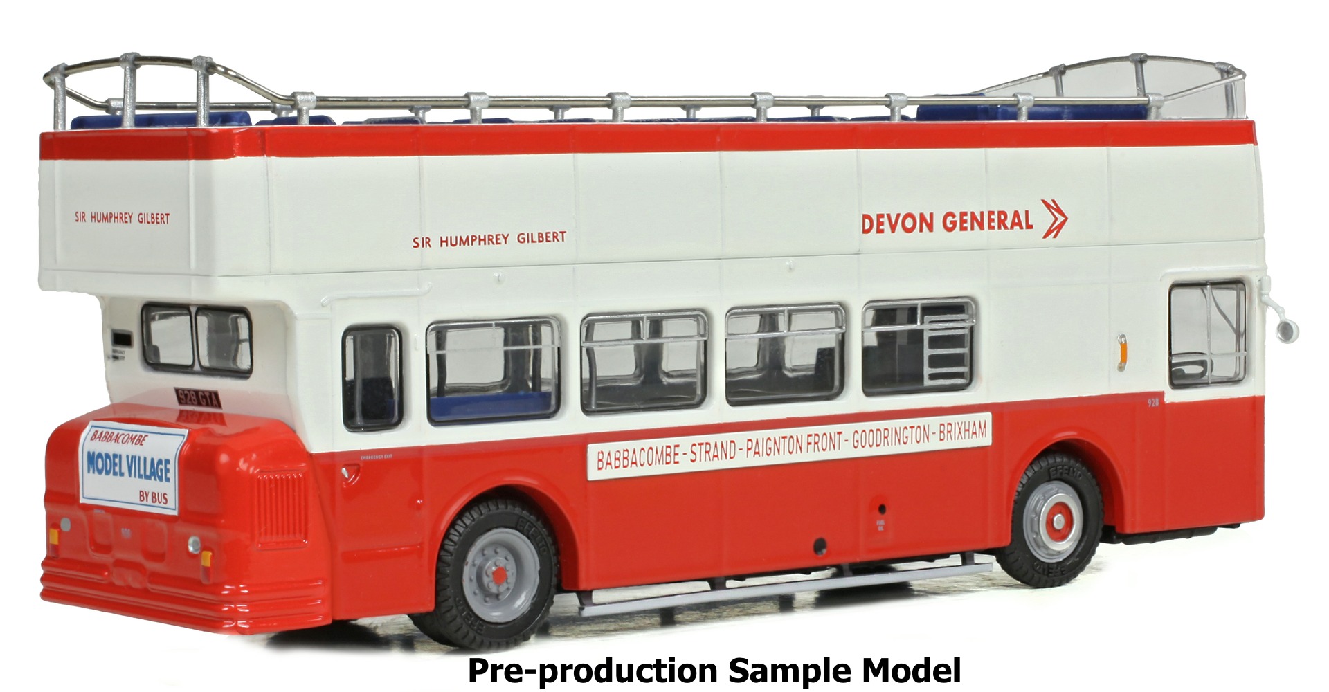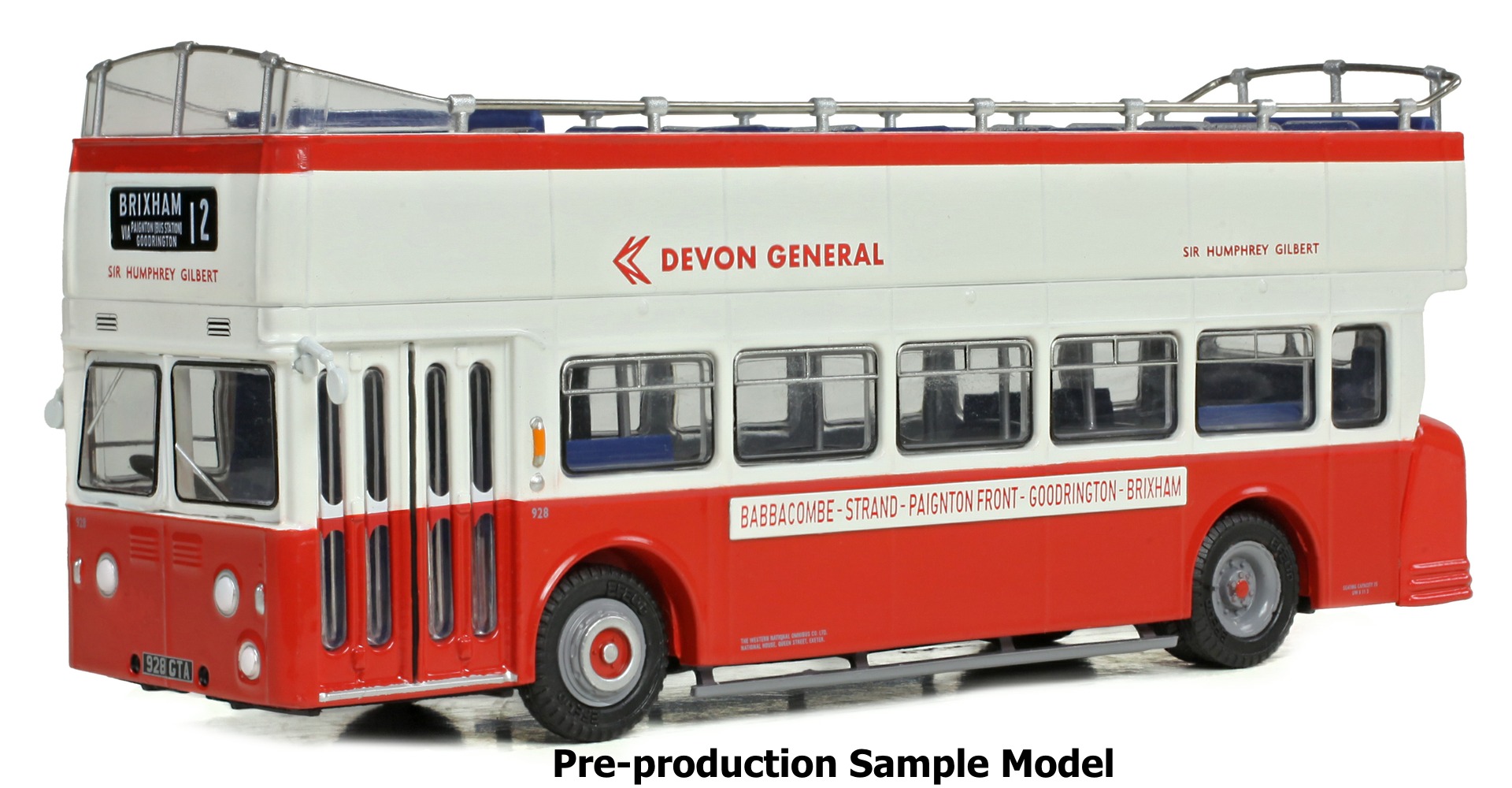 | Notes | Model has side route boards reading "Babbacombe - Strand - Paignton Front - Goodrington - Brixham" & carries the name "Sir Humphrey Gilbert". EFE Road Model Description: This model depicts registration 928GTA ‘Sir Humphrey Gilbert’ in its early NBC condition as fleet number 928, finished in poppy red and white with Devon General branding, as operating on service 12 to Brixham. It also features period advertising on the original-style rear engine bustle and separately fitted destination banner boards on the body sides. |
