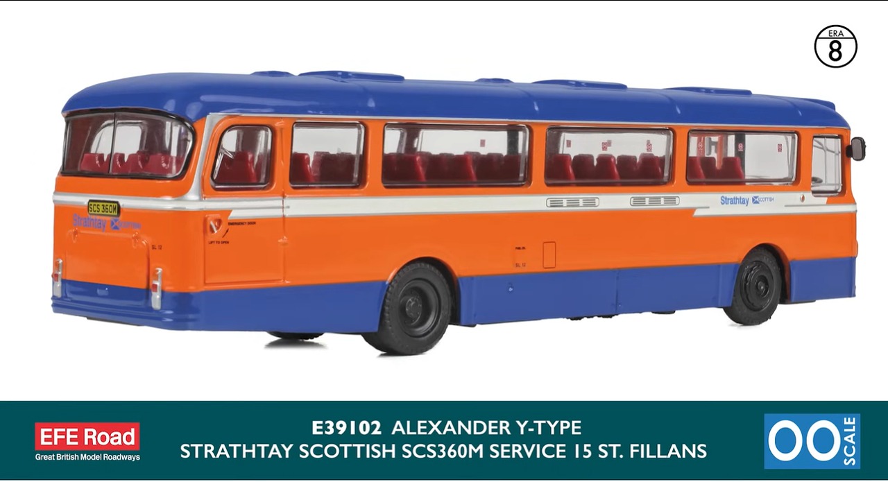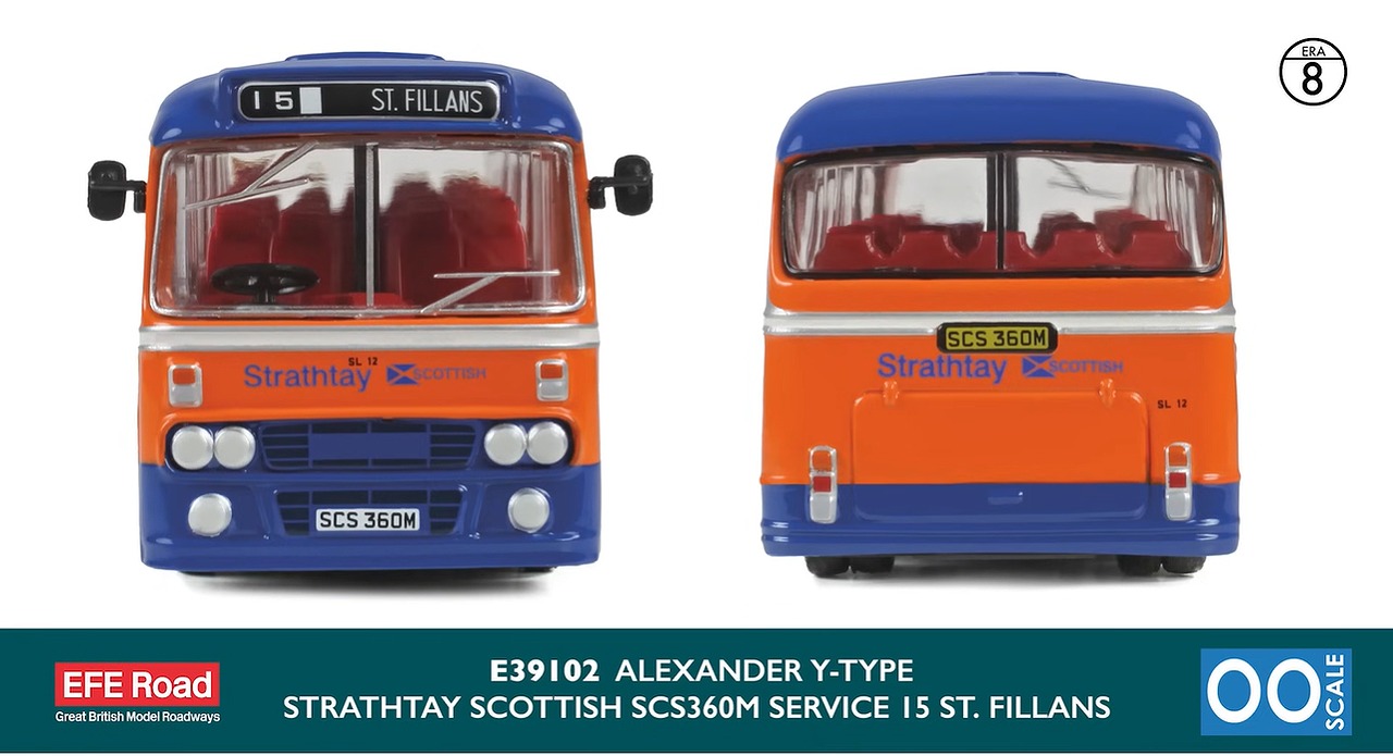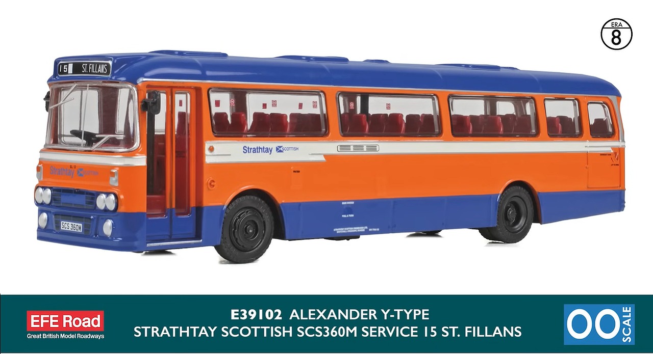 Vehicle Details & Notes | This model depicts Strathtay Scottish fleet number SL 12, registration SCS360M; an AY-Type bodied Leyland Leopard built in 1975. It was part of a batch of 43 dual purpose 49-seaters that originally operated with Western SMT from new. The model captures it during its time with Strathtay Scottish, wearing full orange and blue livery, complete with 2-leaf doors, as working Service 15 to St. Fillans in Perthshire. Era 8 (1982-1994) |