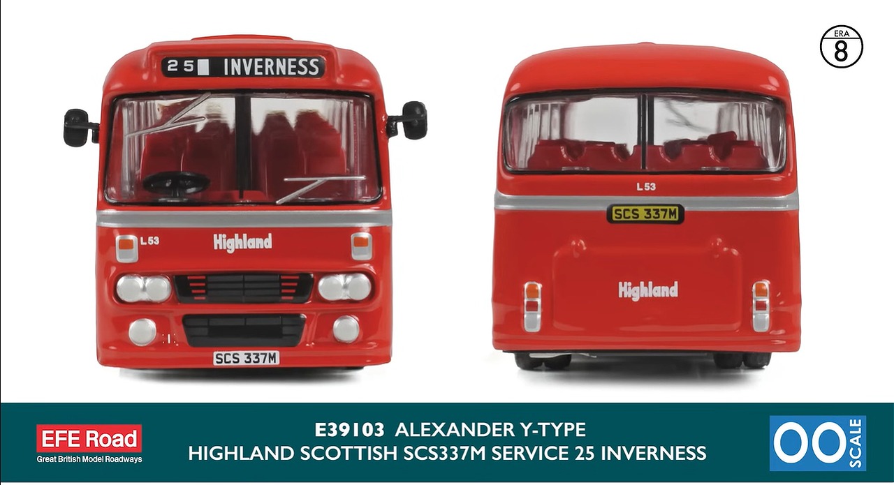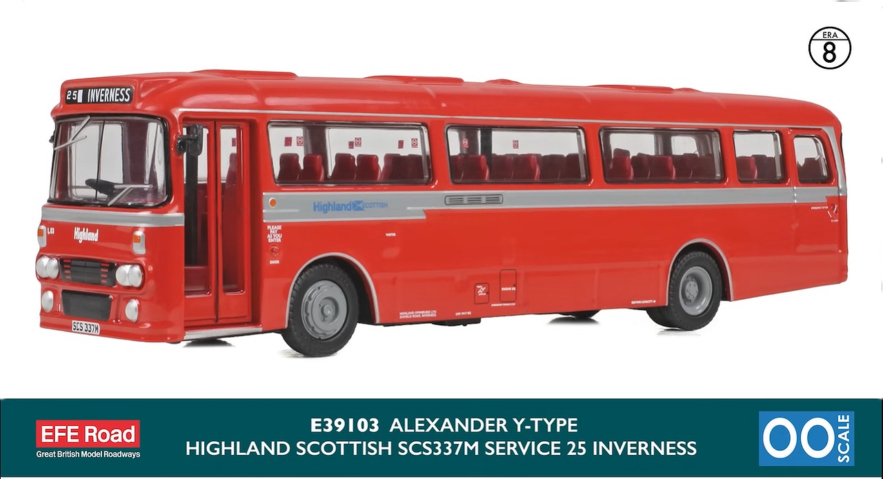 Vehicle Details & Notes | Our model represents registration SCS337M, an AY-Type bodied Leyland Leopard built in 1974 as part of a batch of 43 dual purpose 49-seaters for Western SMT. This example later became part of the Highland Scottish fleet, operating as number L53. The model depicts it in its circa 1984 condition, again with 2-leaf doors, as working Service 25 to Inverness. Era 8 (1982-1994) |
