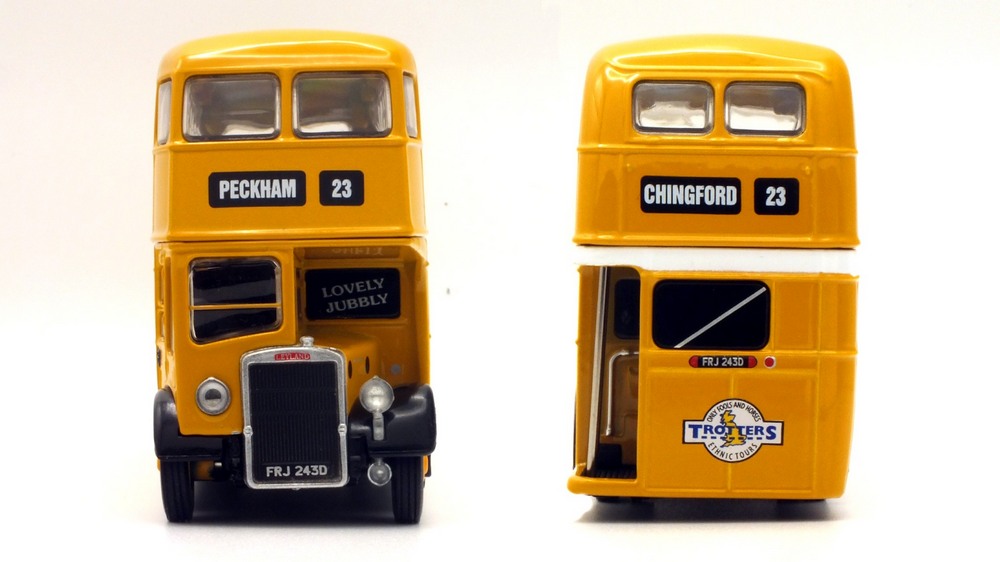 | The Only Fools & Horses Appreciation Society's latest 1:76 scale model is based on the Oxford Diecast Leyland Titan PD2 double decker. (76PD20xx series). The model depicts former Salford Corporation FRJ 243D which was used by the Society as a mobile exhibition vehicle. The yellow livery is reported to have been applied originally by Suffolk based confectionary business "The Chocolate Box" in the late 2000s. It attended the 2012 Showbus Rally and a photographs can be found on the Showbus.com site. If you like accurate models, then note that a fair degree of artistic license has been used. The real vehicle had a squarer MCW body with a forward entrance & platform folding doors. The livery is however, more or less correct. This is the first new release of this tooling since 2019; it will likely have been internally allocated an SPxxx series product code by Oxford Diecast. This lovely jobbly model is available directly from the Society's online shop & eBay store. It is priced £19.99 plus UK postage of £3.00 standard Royal, or £5.00 48hr Tracked. |