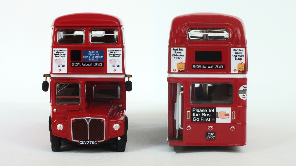 | The following pair of London red EFE Road AEC RML Routemaster models have now been released in the UK and are now arriving with model retailers. These join the three other Autumn quarter models E42301 (Clydeside Scottish RML Oor Wullie Special), E42304 (Southend Transport 121/RCL2256) & London Bus Museum commissioned E42306Z (RML2760) that were released during November. E42302 – AEC Routemaster RML2738 London Buses, Route 15A Upton Park E42303 – AEC Routemaster RML2270 London Transport, Special Railway Service |