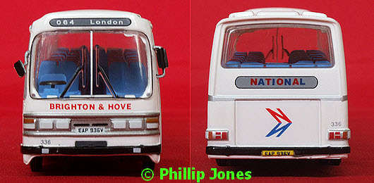 The B-T Models' version is based on a mark II body from 1975, the first pair of releases are almost identical and come in the mainly white livery of National Express. Both have plug type coach doors and front roof mounted destination displays.