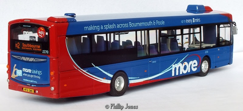 The first release features a Wilts & Dorset bus in the company's blue & red "more" livery, the livery is an updated version of that applied too the two earlier more mark I models (OM46012) released back in 2009. Indeed the same pair of routes, m1 & m2, have been picked by Corgi for both releases.