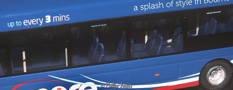 Another slightly disappointing feature is the printing of the yellow interior mounted grab rails on the outside of the door glazing, this is somewhat strange as they appear to have been correctly printed behind the glazing on the majority of the earlier mark I releases. The same niggle also applies to the side and rear destinations displays which have been applied in the same manner.