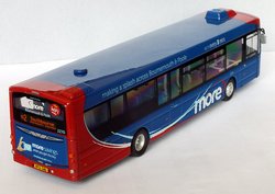 The treatment of the rear is likewise good bar the aforementioned destination display. There's quite a bit of tampo printed detailing here including a nice advertisement for the "more Key" travelcard and a "Free WiFi on board" sign on the window. The Wright badge is tampo printed in silver below the window which also has a tiny emergency exit sign at the top. Several more of these decals can be found on the side windows.