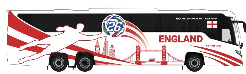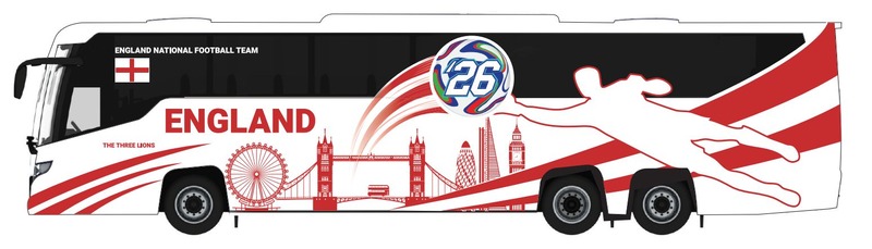 | Iconic Replicas has announced a series of ten 1:87th scale coach models in various National Football Team liveries for the upcoming 2026 World Cup. The models are based various different coach types including Scania, Mercedes Benz, Prevost, Van Hool & MCI, the full range so far, can be found on trade wholesalers' John Ayrey's Diecast site. Each model has a UK RRP of £42.99 and they are expected to be available later this year. If your interested in any of the models, please ask your model retailer about availability. An England Team coach is among the ten models and features artwork depicting various London landmarks, including a Routemaster crossing Tower Bridge: 870724 England National Soccer Team (The Three Lions) - MCI D4520 Coach |