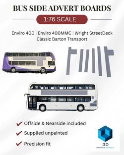 | A round up of some recent new products from kit & accessory suppliers. Saltire Model Kits The latest kit release is the Volvo 9700 coach, The resin kits are priced £53.50 plus postage. Saltire have also released a set of Modern Coach Mirrors £3.85 plus postage. Contact details and other Saltire kits can be found on the Saltire Model Kits Page. 3D Printing Corner 3D Printing Corner now has a selection of bus side advert boards. Available for following 1:76 scale models: